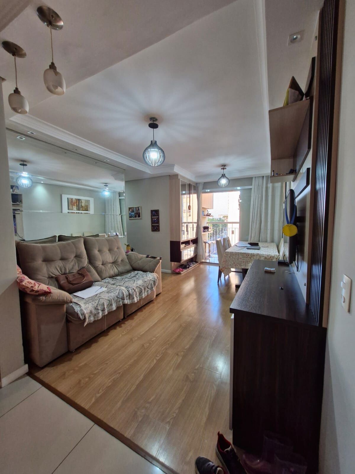 Logo na entrada você se depara com a sala para dois ambientes, piso laminado e uma sacada integrada com churrasqueira a carvão. A cozinha possui armários e a Área de serviço com ventilação natural.